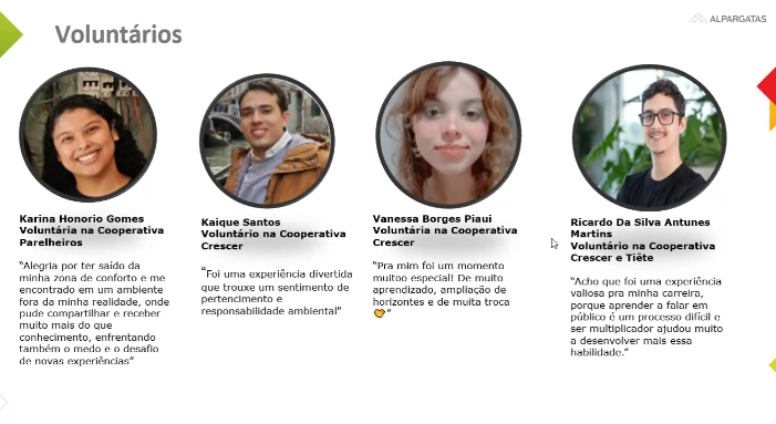Na ação Multiplicadores de Conhecimento; uma parceria AVA, ALU, Havaianas reCICLO e FEPACOORE, os voluntários foram convidados a ministrar aulas sobre gestão financeira pessoal e comunicação não-violenta para desenvolvimento dos cooperados das cooperativas parceiras. O apoio da capacitação ministrada pela Universidade Corporativa, ALU, foi essencial para que eles estivessem preparados para ensinar e se comunicar com um público amplamente diversificado, com diferentes idades e histórias de vida.
